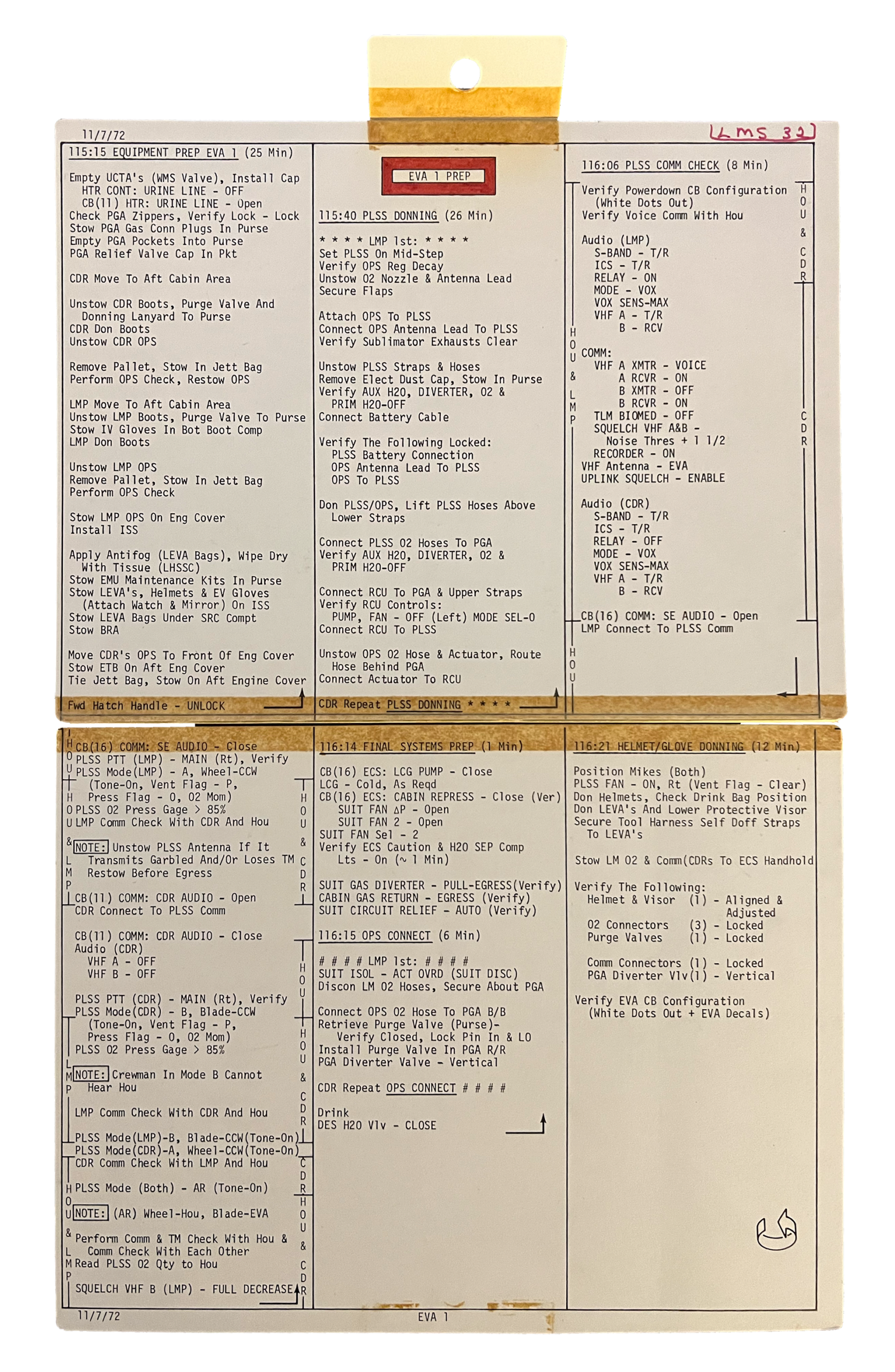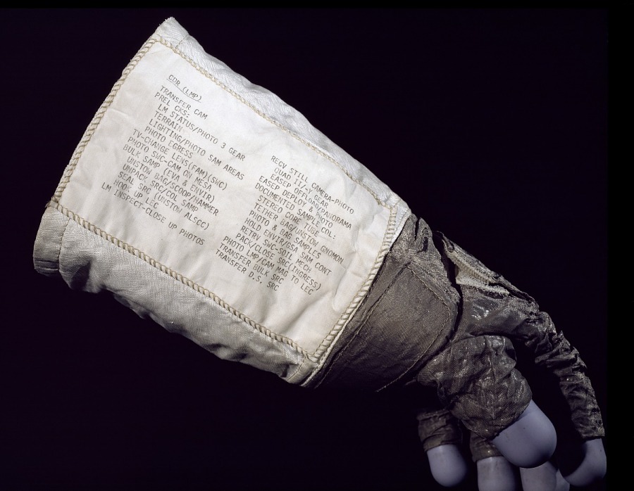 Bei den Apollo-Mondspaziergängen kamen zusätzliche Checklisten zum Einsatz, die die Astronauten mit sich führten. Während die Checklisten von Neil Armstrong und Buzz Aldrin noch direkt auf den Handschuhen befestigt waren (hier zu sehen: Armstrongs Handschuh; Bild: Smithsonian National Air and Space Museum), trugen die Astronauten ab Apollo 12 kleine Büchlein – sogenannte Cuff Checklists –, die am Ärmel des Raumanzugs angebracht waren (hier abgebildet: die Checkliste des Apollo-17-Astronauten Gene Cernan; Bild: RR Auction).