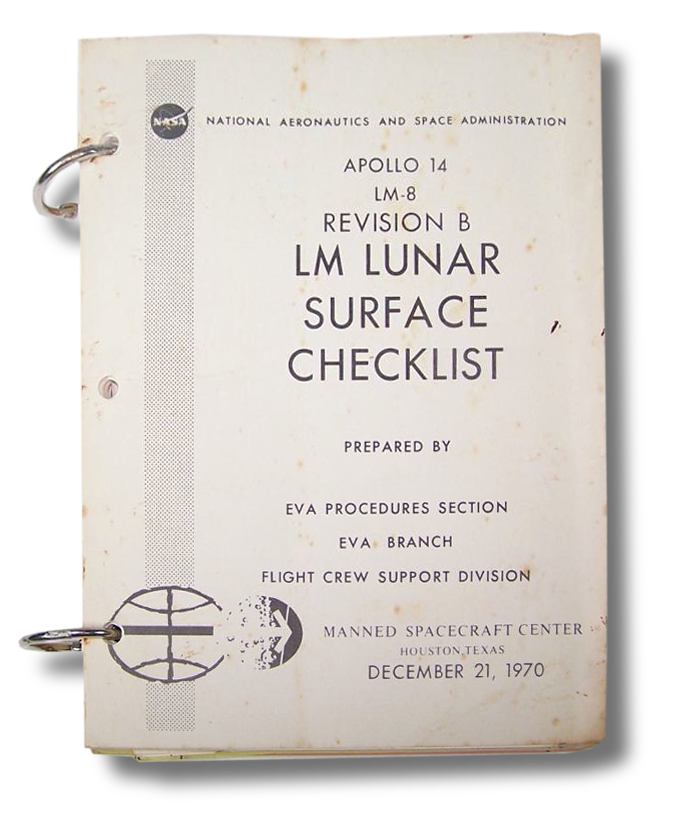 Innerhalb dieses Systems nahmen die Checklisten eine zentrale Rolle ein. Für jede Missionsphase – Start, Erdumlaufbahn, Trans-Mondflug, Landung, EVA und Rückkehr – existierten eigene, detaillierte Hefte mit Schritt-für-Schritt-Prozeduren. Im Durchschnitt kamen pro Mondmission mehr als zwanzig solcher Dokumente zum Einsatz, darunter grossformatige System- und Notfallchecklisten sowie kleinere Checklisten für spezifische Teilaufgaben, etwa die Fehlersuche im Lunar Module oder die detaillierte Lunar Surface Checklist mit sämtlichen Arbeitsschritten auf der Mondoberfläche. Diese Dokumente waren formale Referenzen unter strenger Konfigurationskontrolle und bildeten die verbindliche Grundlage aller Handlungen an Bord.