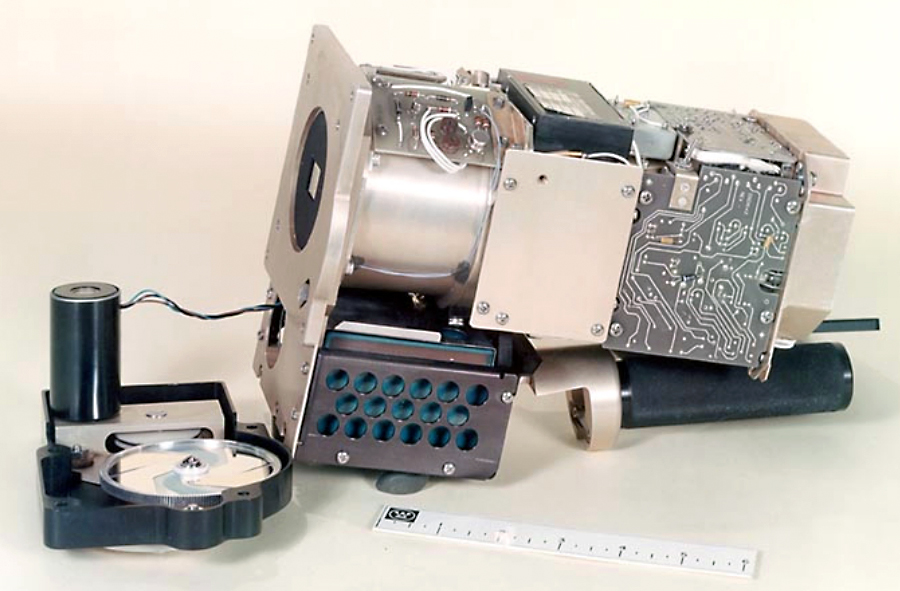 Die Westinghouse Field Sequential Color Camera ohne Gehäuse. Das Farbrad ist links ausgebaut (liegend) zu sehen.