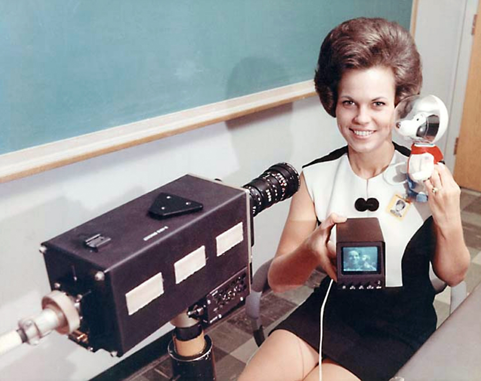 Eine Westinghouse-Mitarbeiterin zeigt den speziell angefertigten Videomonitor und eine Snoopy-Puppe, mit der die Funktionen der für die Apollo-Raumfahrtmissionen gebauten Farbkamera vorgestellt werden.