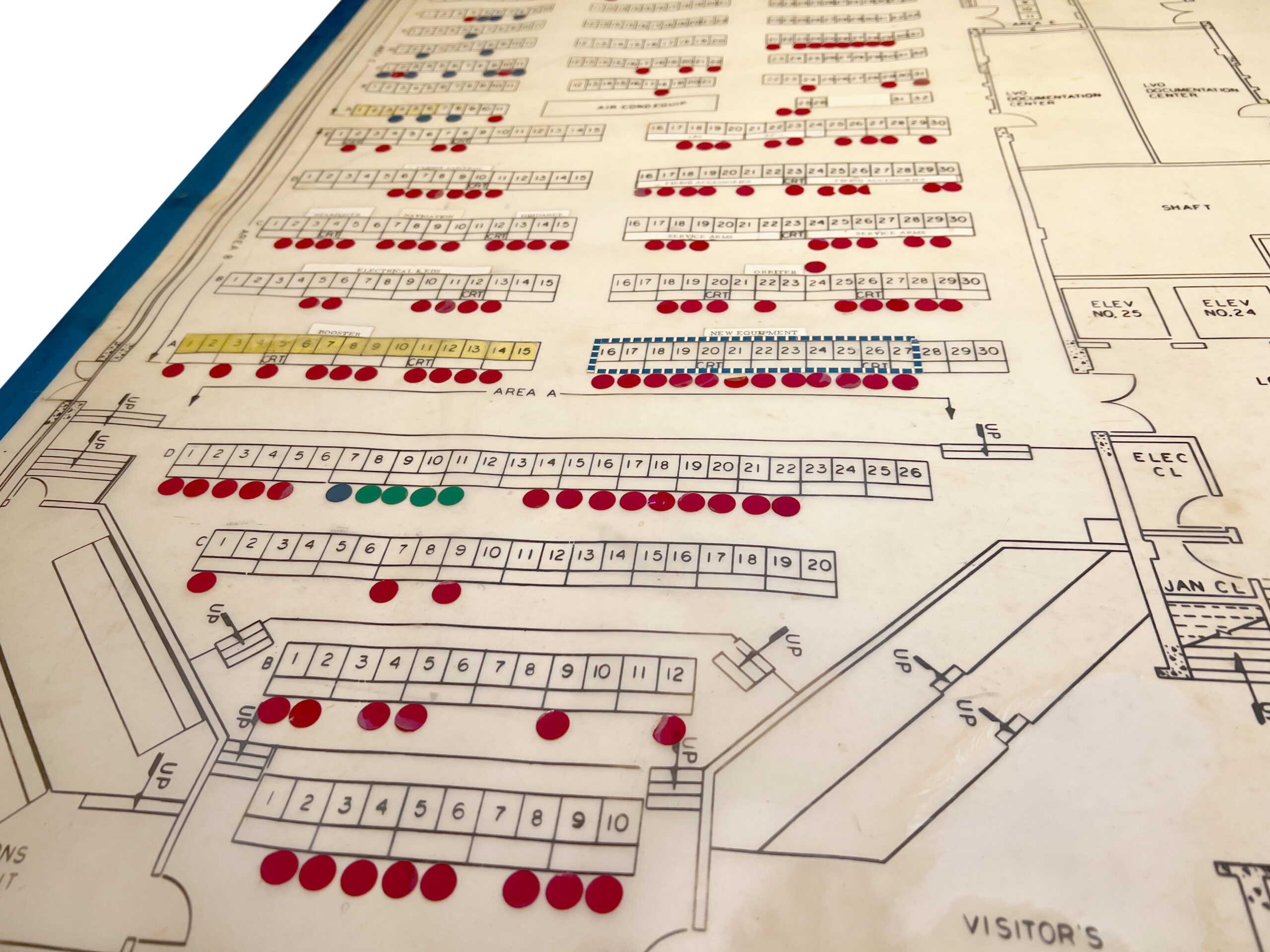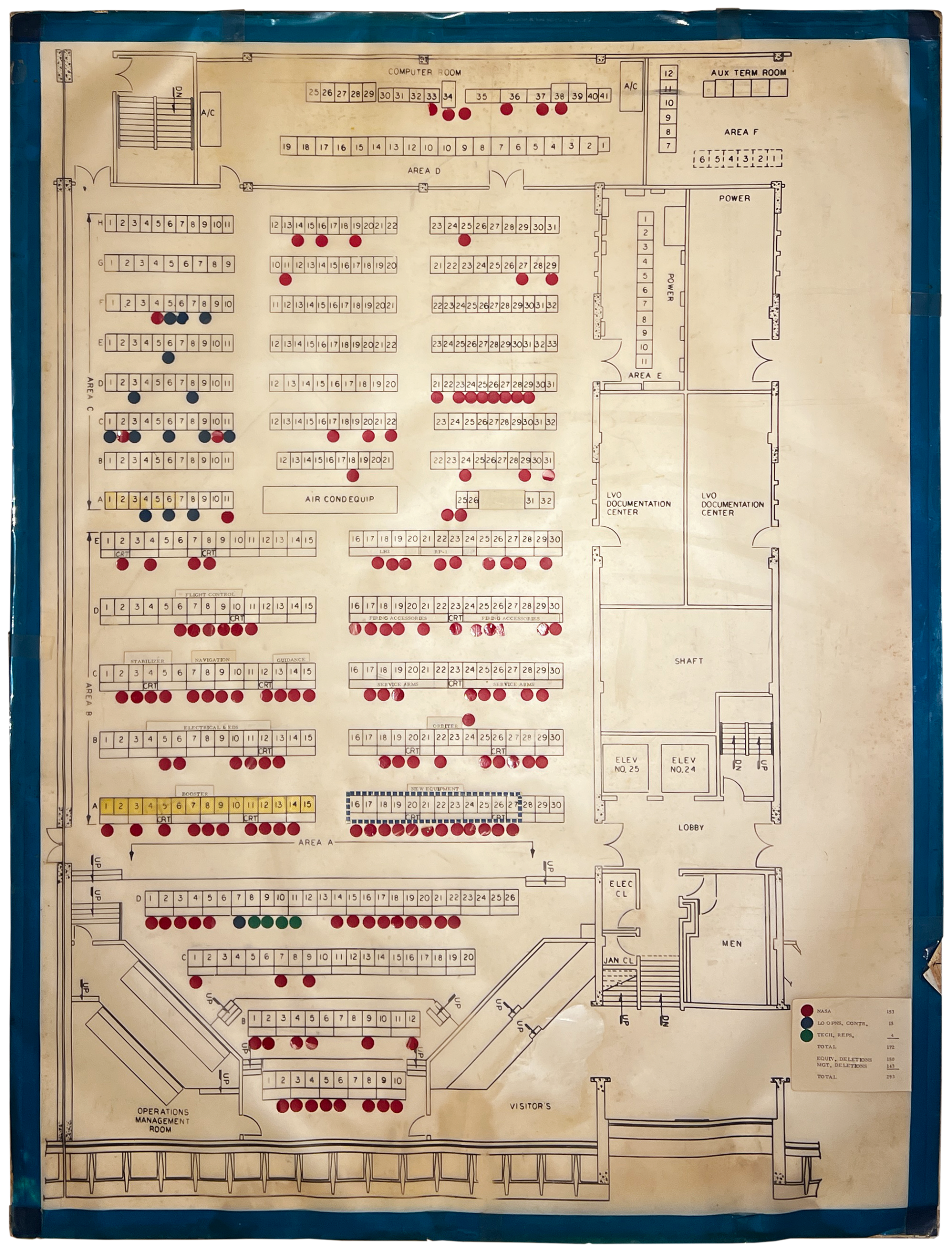 Hier zu sehen ist eine grossformatige Orientierungstafel aus Karton mit der Layout-Darstellung des Firing Rooms im Launch Control Center (LCC), die während den Startvorbereitungen zur Apollo-11-Mission im LCC benutzt worden ist. (Sammlung Guido Schwarz)