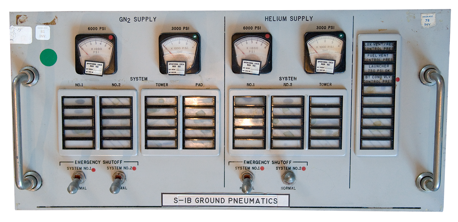 Das Ground Pneumatics Panel überwachte die Drücke in den Systemen, die Gase zur S-IB-Stufe lieferten. Helium wurde zur Druckbeaufschlagung der LOX-Tanks verwendet, während gasförmiger Stickstoff (GN) verschiedene Kammern der Stufe spülte, in denen sich sonst explosive Gasgemische hätten bilden können.