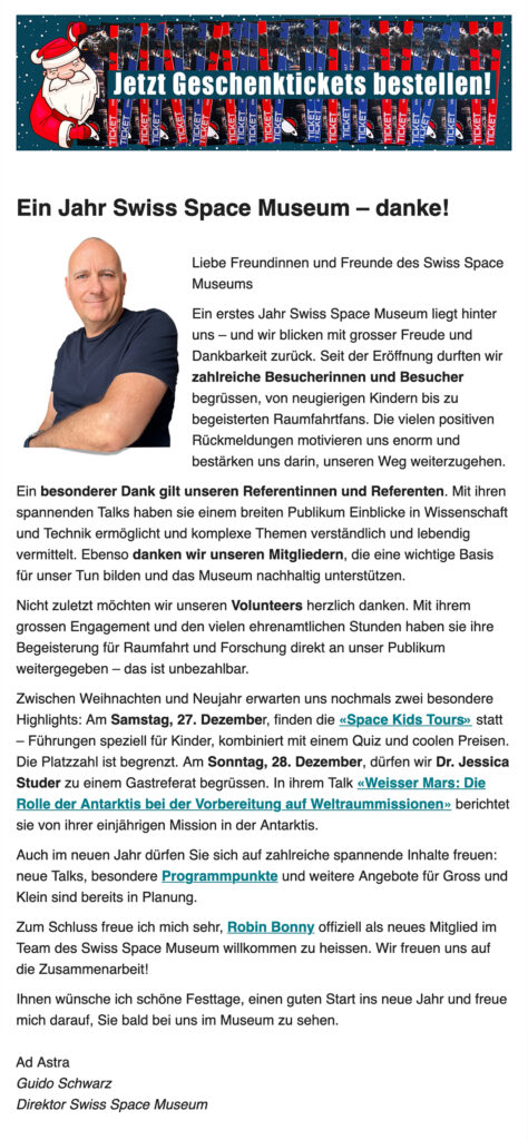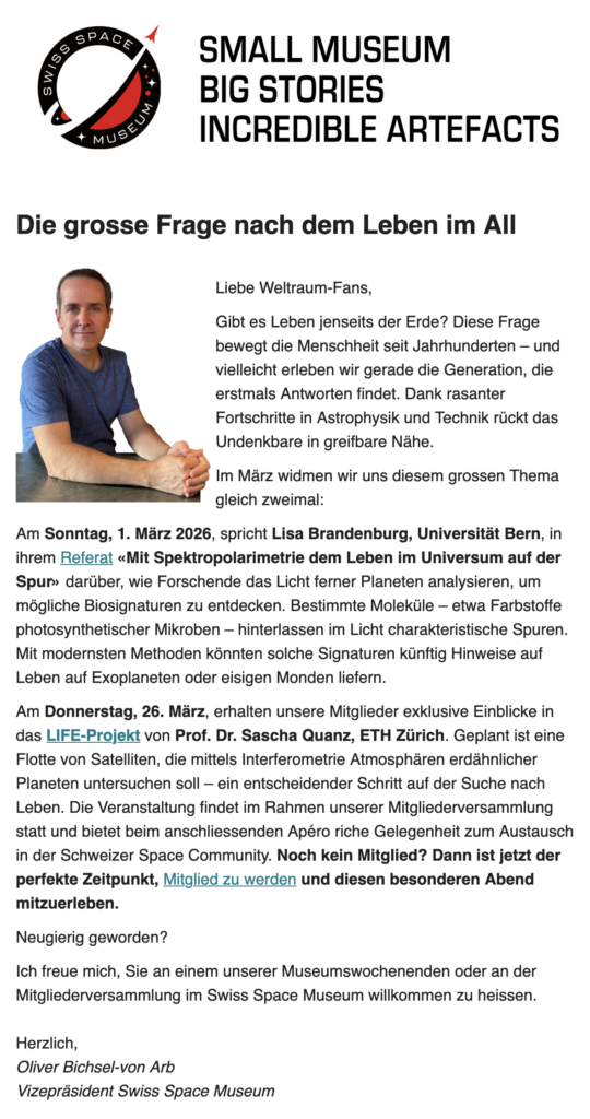 Mit unserem Newsletter erfahren Sie als Erster von neuen Events, Ausstellungen und Angeboten. Lesen Sie unseren exklusiven Gast-Blog. Werden Sie Teil unserer wachsenden Swiss Space Community und geniessen Sie exklusive Einblicke in die faszinierende Welt von Raumfahrt, Weltraumforschung und der damit verbundenen Popkultur.